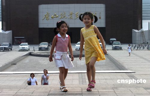 两名天真烂漫的唐山女童在位于市中心的唐山抗震纪念馆前玩耍