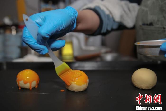 图为黄婉菁为蛋黄酥刷蛋液。(瞿宏伦 摄)