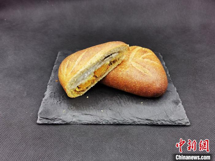 图为黄婉菁制作的咸蛋黄芋泥肉松全麦面包。(周燕玲 摄)