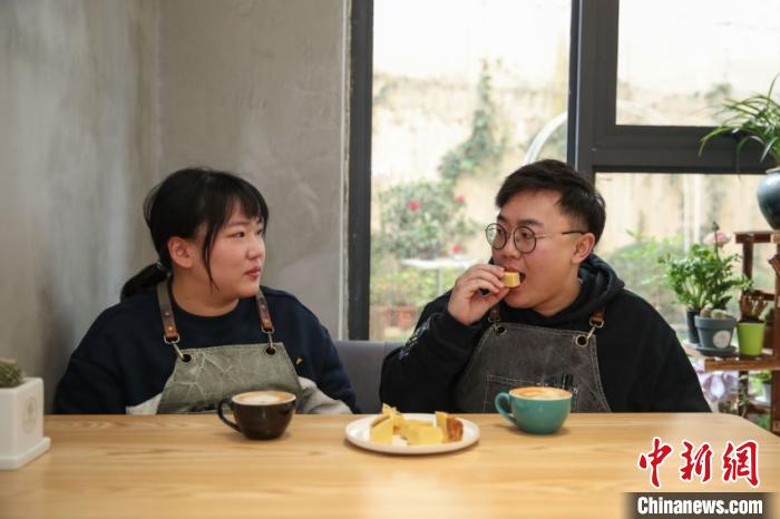 图为闲暇时,黄婉菁与王舟一起坐下来喝咖啡吃凤梨酥。(周燕玲 摄)