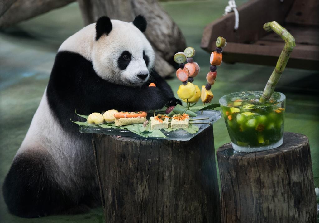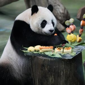 在台北市立动物园,大熊猫“圆仔”正在品尝特制的7岁生日蛋糕(资料照片)。新华社记者 金立旺 摄