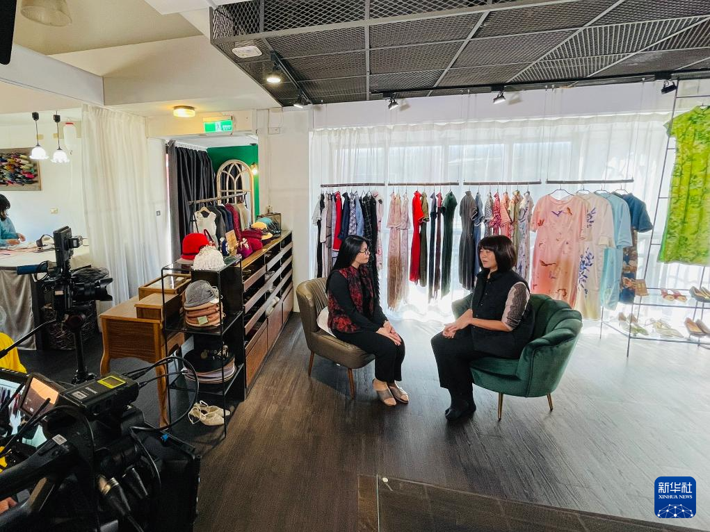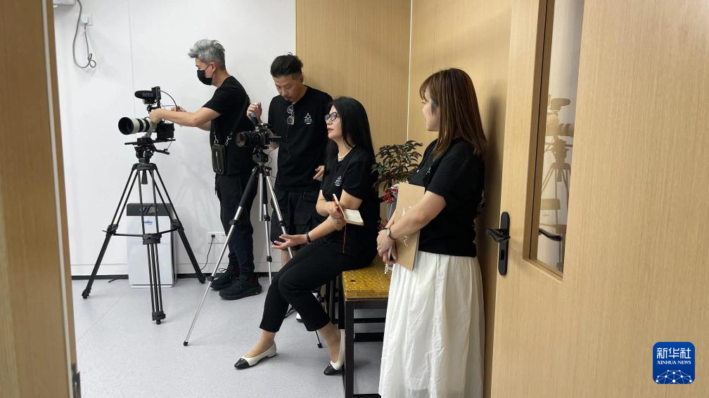 2021年12月29日,赵丽娜(右二)在台湾宜兰传统艺术中心采访拍摄“城市影像”纪录片。新华社发