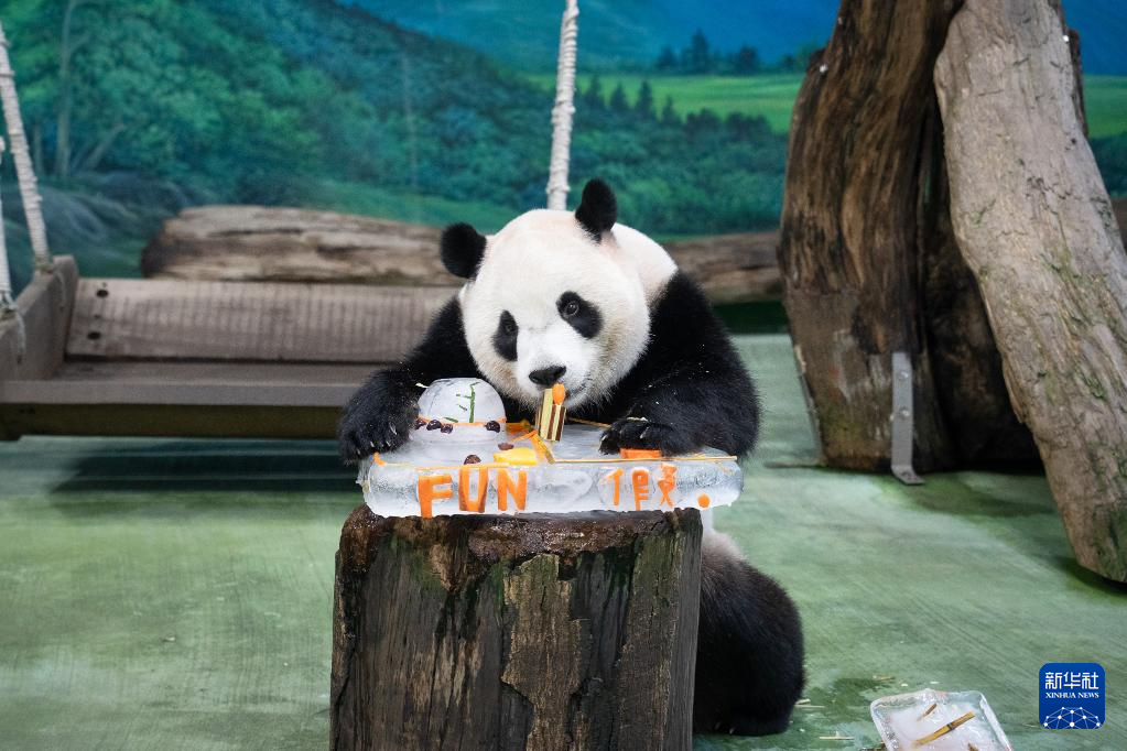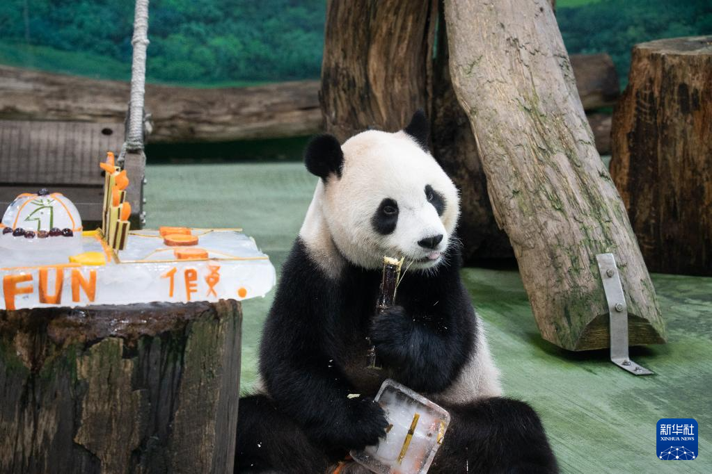6月28日,大熊猫“圆宝”在享用园方以甘蔗、凤梨、竹子等食材制作的冰块蛋糕。新华社发(台北市动物园 供图)
