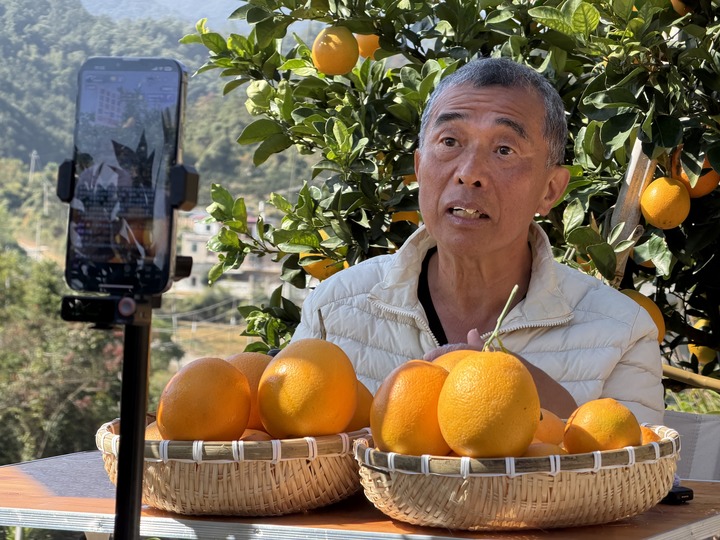 台湾嘉义的王文瑞在祖籍地——江西赣州直播推介赣南脐橙,他的“台湾阿公”新媒体账号吸引全网超100万粉丝关注。新华社记者 陈柱佐 摄
