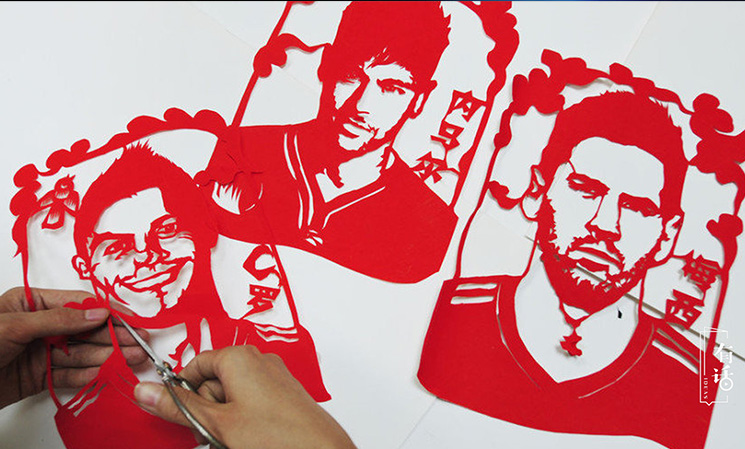 我之前剪过的民俗剪纸作品,像《白蛇传》、《七月七鹊桥会》、《夜哭郎》等等,这些题材承载的是我们的传统。但这些较为传统的剪纸受众并不多,所以我认为青年人要有新的创新,加入现代社会中许多时尚前卫的元素,这样才能获得更多人的喜爱。在2014年世界杯的时候,我就试着剪“世界杯剪纸”,梅西、C罗、内马尔,让一些球星跃然纸上,让热爱足球的年轻人去关注、了解到传统的剪纸艺术。2015年是世界反法西斯战争胜利70周年,我看到关于战争的一些资料图片后,就创作了一幅《南京大屠杀》剪纸。画面中运用了黄色、红色、黑色表现土地、火焰还有愤怒,这些都是用剪纸来表达我心中的感受。我的工作室现在也会做一些时尚的婚纱照剪纸,还有生日剪纸等,把这些传统吉祥的寓意融入到现代人们的需求、装饰和礼物中。