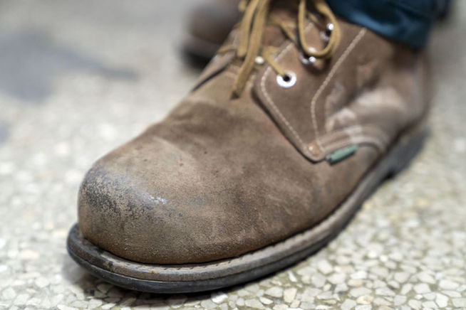 这不是普通的运动鞋,而是特制的劳保鞋——鞋尖有钢板,底部有钢钉,鞋底目测有近两厘米厚。