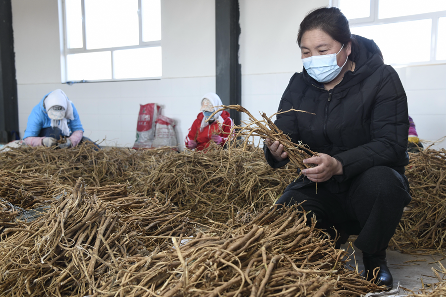 2020年3月13日,赵会杰在村里的种植专业合作社了解中药材加工生产情况。新华社发(王健 摄)