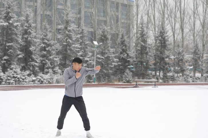 天微亮,田径场上已铺满积雪。跑道中央站着一名身着灰色运动服的小伙儿,只见他向空气中挥出一拳又一拳,地上也留下了一圈圈脚印……