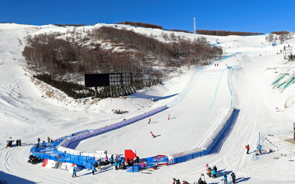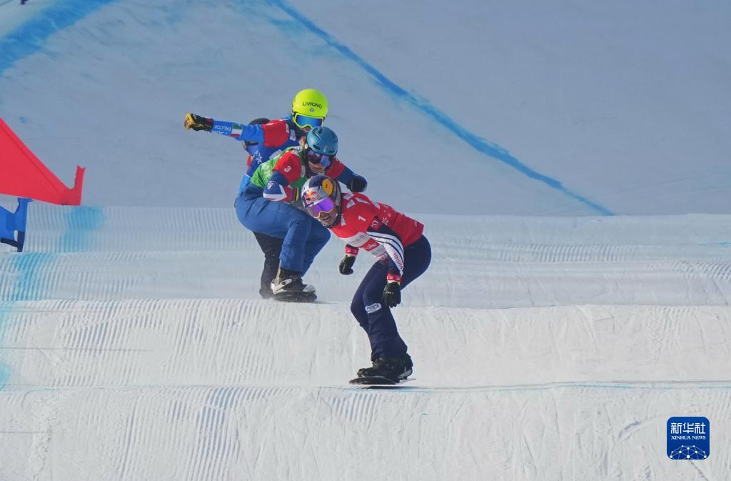 11月28日,捷克选手埃娃·萨姆科娃(前)在“相约北京”系列测试赛2021/2022国际雪联单板滑雪障碍追逐世界杯女子组决赛比赛中。