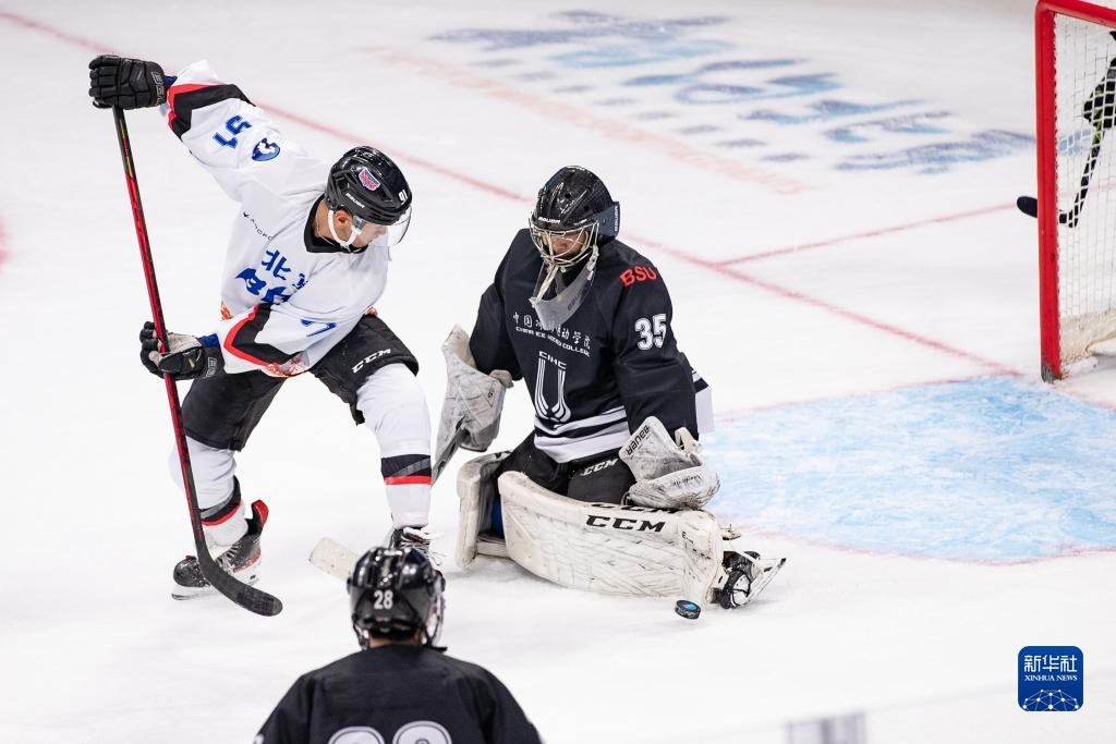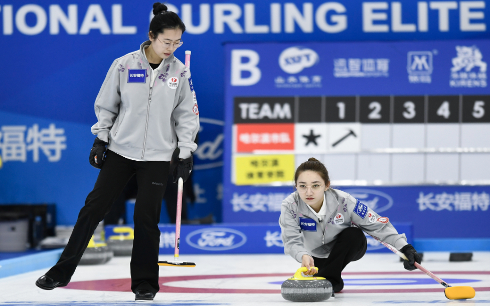 4月21日,哈尔滨体育学院队选手姜思淼(右)在青海多巴国家高原体育训练基地进行的中国冰壶精英赛中国公开赛(中国·青海)女子团体决赛中掷壶。