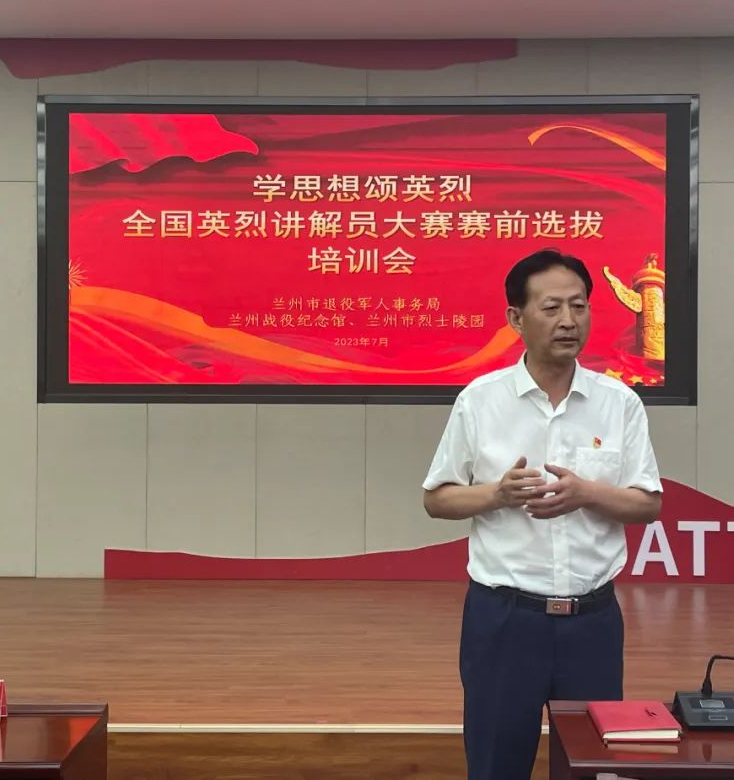 为深入学习贯彻习近平总书记关于烈士褒扬工作重要指示批示精神,讲好英烈故事,弘扬英烈精神,传承红色基因,营造崇尚英烈、缅怀英烈、捍卫英烈、关爱烈属的浓厚氛围,不断提升兰州战役纪念馆、兰州市烈士陵园英烈讲解员能力水平,积极备战全国英烈讲解员大赛,兰州战役纪念馆、兰州市烈士陵园联合举办全国英烈讲解员大赛赛前选拔培训会暨全国英烈讲解员大赛选拔比赛,馆园领导出席并讲话。