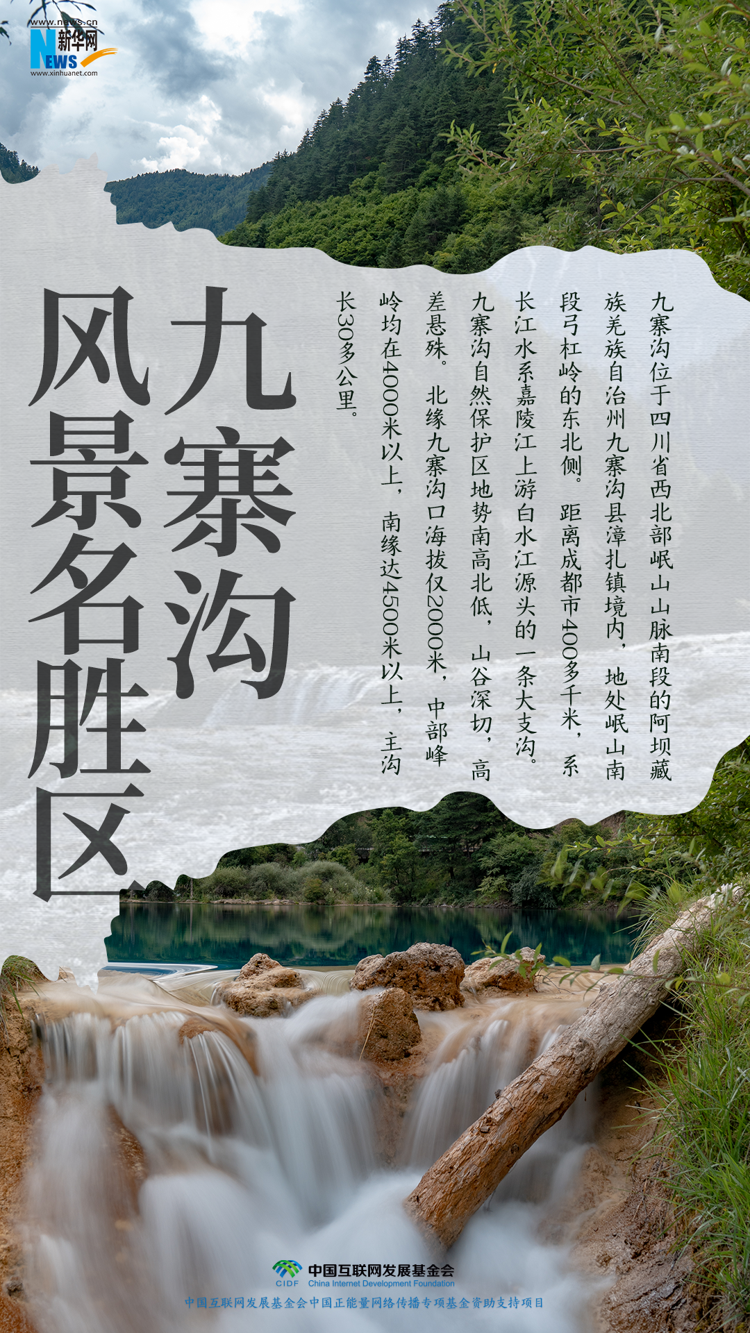 九寨沟位于四川省阿坝藏族羌族自治州南坪县。是白水江上游白河南岸一条大支沟。海拔在2000米以上,森林面积占42%,沟内原有九个藏族村寨,故名九寨沟。原为林区,在崇山峻岭中,自然风光极其优美,分布有108个海子(湖泊),各湖之间多飞瀑,如树正瀑布、诺日朗瀑布,气势磅礴。有大熊猫、金丝猴、扭角羚等珍贵动物。是大熊猫、金丝猴自然保护区。1992年被列入《世界自然遗产名录》。