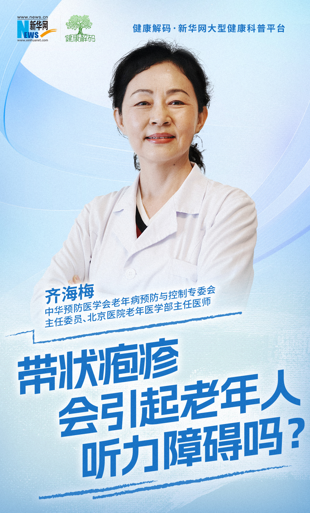 齐海梅:造成老年性听力损失的原因主要分为两种:一是全身器官功能自然退化;二是与外在因素有关,包括环境噪音、服用耳毒性药物或其他疾病所引发,如心血管疾病、糖尿病、以及带状疱疹。其中,耳带状疱疹是带状疱疹较为典型的临床类型,系病毒侵犯面神经及听神经所致,表现为外耳道疱疹及外耳道疼痛。膝状神经节受累同时侵犯面神经和听神经时,可出现面瘫、耳痛及外耳道疱疹三联征。50岁及以上、慢性病(如糖尿病、慢性肾脏疾病、慢性阻塞性肺疾病等)、自身免疫性疾病(如类风湿关节炎、系统性红斑狼疮等)、免疫功能低下人群更需要引起重视。