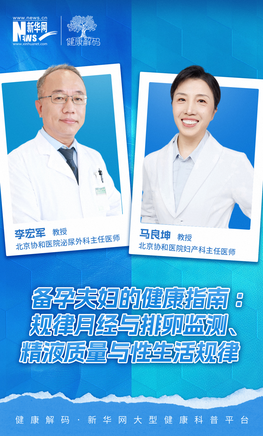 本集节目我们邀请了北京协和医院妇产科主任医师马良坤教授、北京协和医院泌尿外科主任医师李宏军教授共同分享《备孕夫妇的健康指南:规律月经与排卵监测、精液质量与性生活规律(下)》。