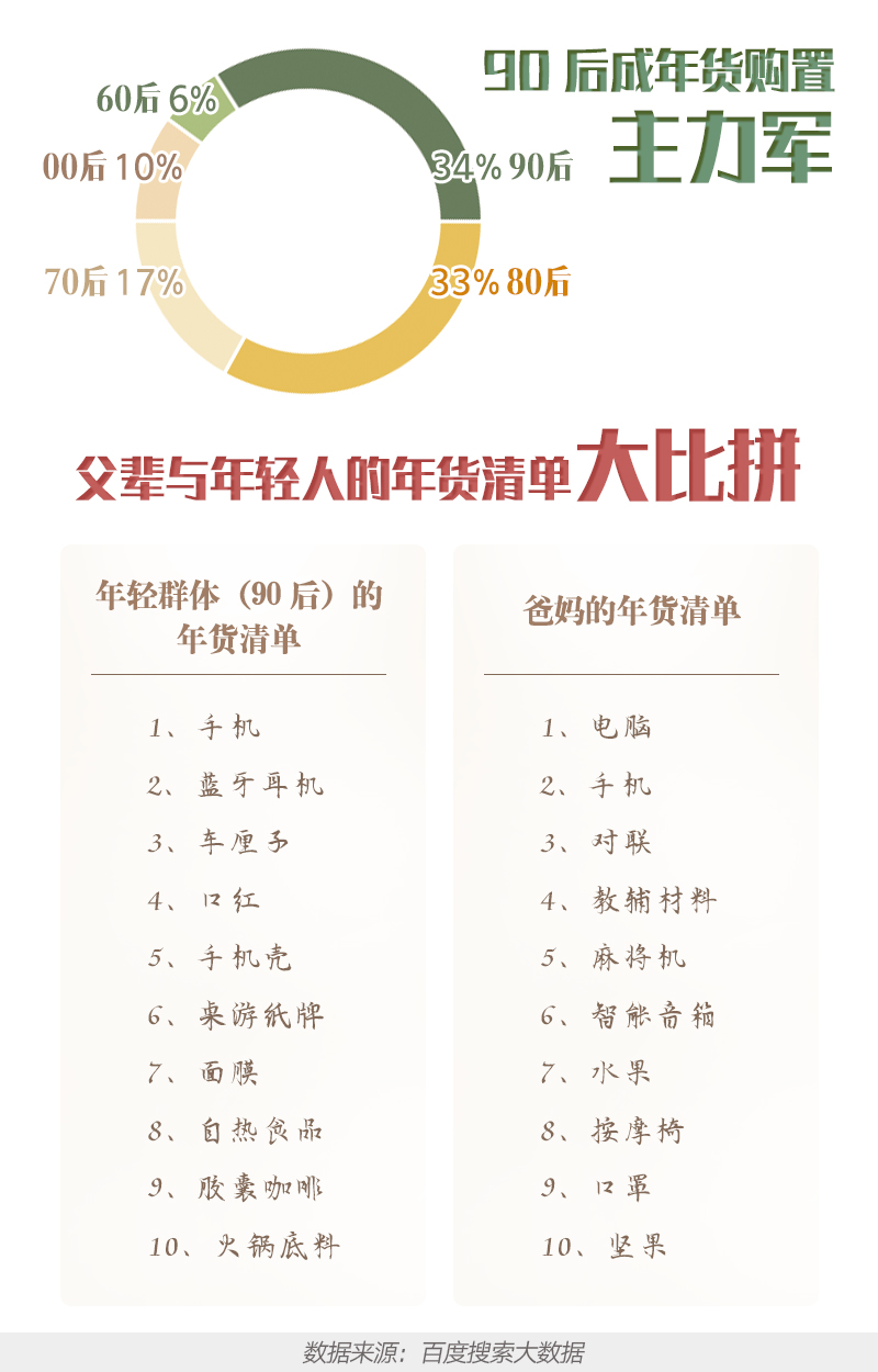 在青睐年货的类型上,不同年龄段各有不同。百度搜索大数据显示,以90后为代表的年轻群体的年货清单集中为数码产品、美妆与零食——手机、蓝牙耳机与车厘子的搜索关注度位列前三。