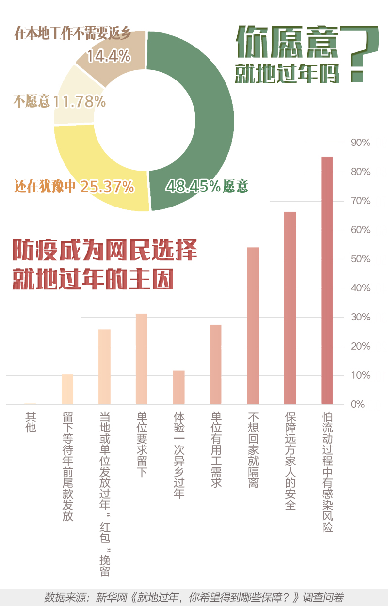 “怕流动过程中有感染风险”是受访者选择就地过年的主要原因,占比为85.11%。“保障远方家人的安全(66.28%)”“不想回家就隔离(54.17%)”排在第二、第三位。安心就地过年,是每位留下的人对疫情防控的贡献。