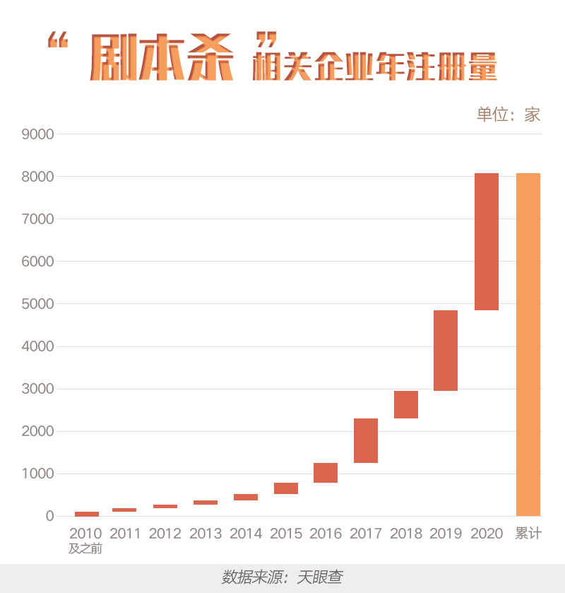 据天眼查大数据显示,从事剧本杀相关企业近年来的发展表现迅猛,有超过6,500家。2020年共新增剧本杀相关企业超过3,100家,较2019年同比增长63%。目前知名的线上剧本杀平台、剧本杀游戏社交平台有我是谜、天天剧本杀、推理大师、百变大侦探、天天狼人杀等。