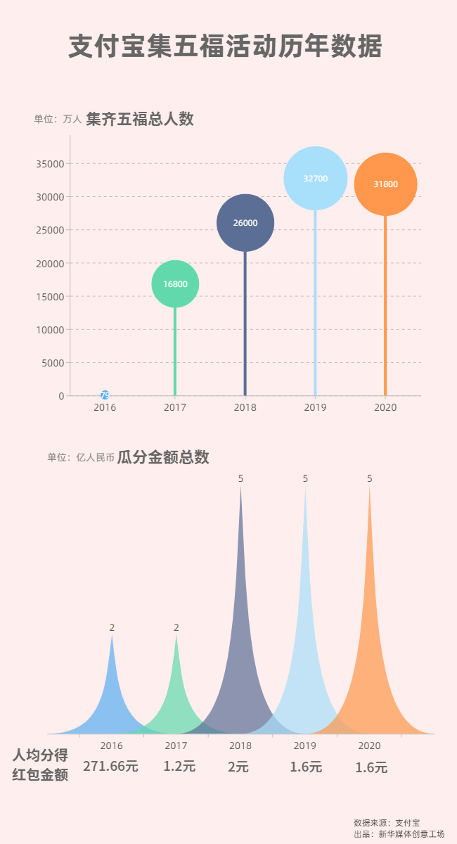 自2016年支付宝推出“集五福”的活动至今已有五个年头。从最开始只有几十万用户参与,到如今几亿人共同狂欢。支付宝数据显示,截至2月11日零点,支付宝集五福活动共写下近5.7亿个福字,共2.6亿网友在线上手写了福字,送给亲朋好友,其中还有350万福字通过支付宝打印、寄送回家。今年参与红包拜年的用户上涨了近270%,“红包”相关搜索量也随之大涨538%。