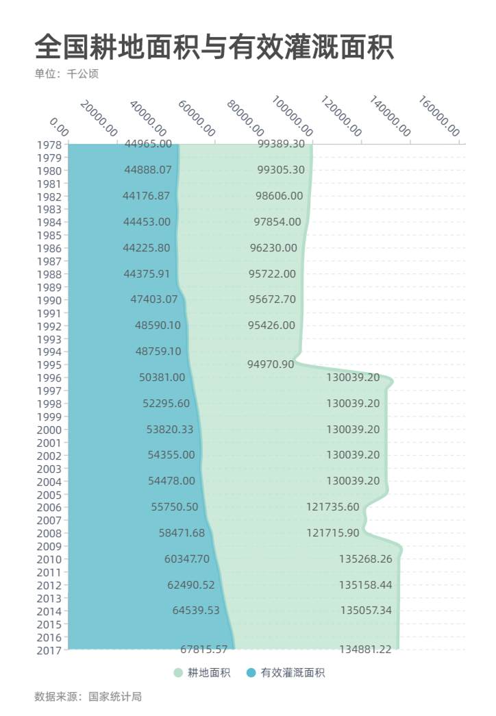 五十年代开始,全国开始了大范围垦荒运动。凭着“艰苦奋斗”的信念,人们把颗粒无收的荒地变成了丰饶多产的良田,北大荒变北大仓。随后的几十年时间里我国耕地面积平稳上升,在近几年守住了那根红线。