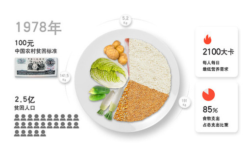 1978年,广大农民的餐桌上多是粗粮,鲜有肉蛋,食物支出占总支出比重85%以上。到了2008年,贫困人口饮食结构发生明显改变,可以实现“有吃、有穿”,基本满足温饱,食物支出占比降至60%左右。