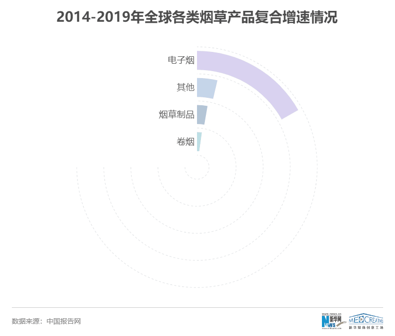 根据《2020年全球电子烟行业及细分市场规模、市场份额情况分析》报告显示,电子烟行业增速遥遥领先卷烟和其他制品,其2014-2019年年复合增速达到24.2%,远高于卷烟(3.2%)和其他制品(5.3%)增速。