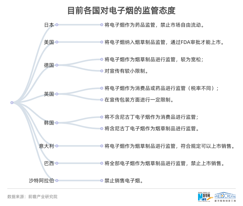 目前,各国对电子烟销售的监管思路和态度也各不相同,如美国、德国、英国等国都有对电子烟严格的监管,沙特阿拉伯等国家禁止销售电子烟。