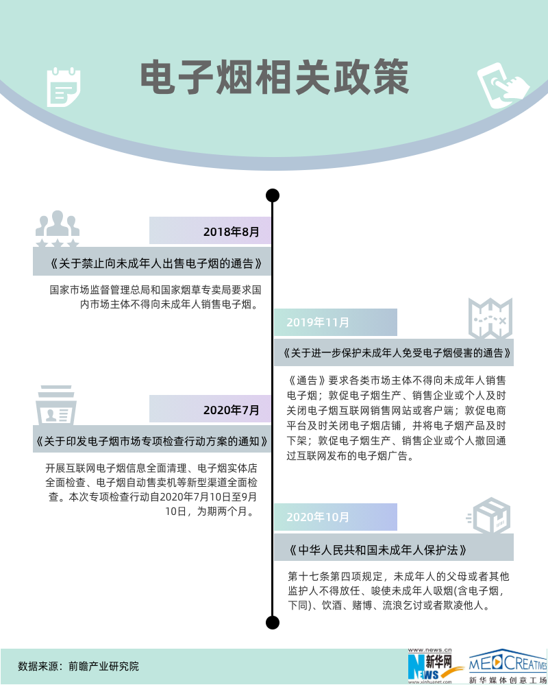 此前,我国关于电子烟的政策监管问题一直是悬在电子烟行业之上的“达摩克利斯之剑”。2018-2020年,我国针对电子烟逐步出台了相关政策,尤其是对容易落入诱惑陷阱的未成年增强了保护,并开始禁止网上销售,电子烟的监管措施正在逐步加强。