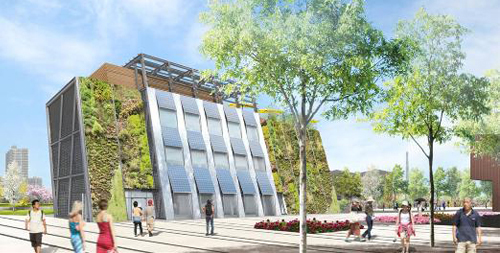 上海世博会上,该案例被建成一个缩减能源需求的展馆,南立面上的水幕太阳能墙体由电脑自动控制,可以随着室外温度和日照强度的变化自动开闭,既能遮阳降温,又能有效减少能源消耗。