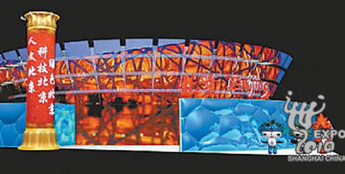 | 北京馆将重点突出“古老与现代”的变迁,新北京将是展示的重点。在北京馆的四大变形效果中,除了天坛是北京传统的象征外,鸟巢、水立方和国家大剧院都是新北京的地标性建筑。北京馆将配合新北京的发展,挑选一些高新技术产品来展示。当然,现代感十足的同时,北京馆也不会完全抛弃老北京文化特色,四合院、小胡同、全聚德等老字号招牌都将现身于北京馆内。展馆内还将依次摆放从上世纪50年代、60年代……直至2010年的电视机,每隔“10年”便会有一台当时的电视机放映着那个年代的大事件。 |