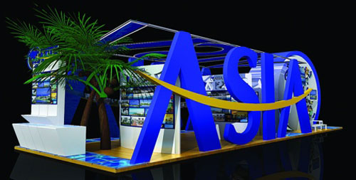 | 展馆采用蓝、银色调搭配,体现科技感、现代感、国际化。以博鳌亚洲论坛标志中的“ASIA”为原型,放大成大型展台的主体,简单、醒目、震撼,体现论坛希望通过区域经济的进一步整合,推进亚洲国家发展的愿望。将标志中的圆形做成球状,与圆弧形的咨询台形成呼应,寓意“世界人民的大团圓”,同时还体现了“理解、沟通、合作共赢、建立和谐城市与美好未来”的含义。展馆用世界地图为背景墙,体现全球化、多元化、一体化。用热带植物与现代化展台搭配,体现在城市经济繁荣的同时,兼顾“绿色”、“和谐”与“文明”的寓意。 |