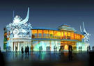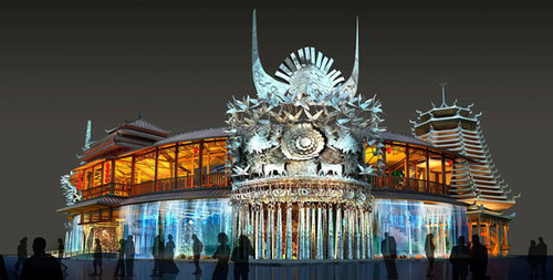| 展馆宛如一位身着盛装的少数民族少女,放大了的银饰左右摆动,相互撞击,发出叮叮当当的响声,给人聆听音乐般的享受,使展览有动有静、有声有色。环状的风雨桥与银饰连为一体,仿佛是盛装少女的头冠,而大面积的水帘犹如盛装少女的短裙随风摇摆。 |
