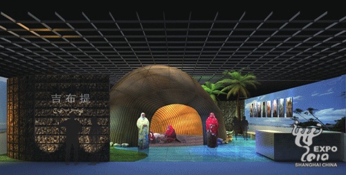 | 展馆一端是游牧民族阿法尔人的传统民居“达布瓦塔”,另一端则由洽谈区、休闲区组成,由一座桥连接。 “达布瓦塔”建于水上,顶部覆盖手编的织带,两壁腰墙和地面分别装饰有手工编织的挂毯和地毯,内墙上挂有吉布提的绘画作品和手工艺装饰品,重点展示吉布提的风土人情、丰富的旅游资源及其作为国际大港口的风釆。展馆内的大屏幕循环播放吉布提的相关纪录片。馆内有网络连接,实现即时互动,不仅吉布提国内的人可通过网络看到展馆里“达布瓦塔”的实景,参观者也可与他们进行“面对面”的交流。 |