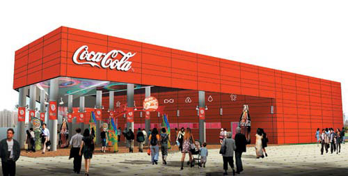 可口可乐馆为一座两层建筑,建筑风格讲求虚实对比和颜色变化,外立面简洁独特,所有的外墙均采用金属防风雨百叶, 刷成“可口可乐”的红色。可口可乐企业馆通过宣传上海世博会“城市,让生活更美好”的主题,提出节能、环保、技术创新和创建高品质生活方式的理念。