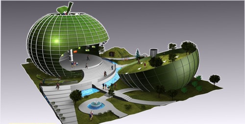 | 罗马尼亚馆的苹果外形和标志文字“GREENOPOLIS”体现了健康生活方式的重要性、对可持续发展理念的关注以及针对现代社会普遍存在问题的以知识为本的解决方案。 |