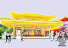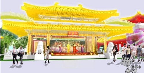 | 陕西馆以盛唐时期的古长安为背景,以唐式宫殿为中心,由主宫殿及两侧角楼构成,两道从宫殿上跨越出的拱形桥与角楼相连,直抵秦岭背景墙前的九龙舫半景,外形流畅,气势磅礴。在陕西馆的入口处,一个高约四米的仿制将军俑将牵手一个现代小女孩人偶,以过去与未来连接的方式演绎世博主题。 |