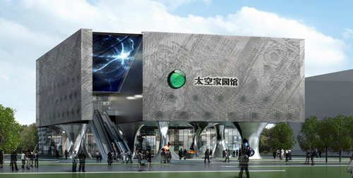 展馆外观以浩瀚的宇宙为背景,仿佛是太空飘来的神秘魔方悬浮在空中,以异型的支柱与地面轻盈连接,形成摆脱重力的视觉效果。馆内分为序馆、剧场和场景,主要围绕“天、地、人”的理念展开,展现航天技术发展对人类的贡献,以及绿色、安全、智能化的未来家园。