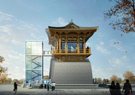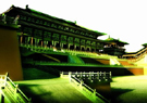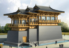 唐•李华《含元殿赋》云:左翔鸾而右栖凤,翘两阙而为翼。根据考古发掘资料和建筑历史学家已有的复原研究,上海世博园西安大明宫的案例依照大明宫主殿——含元殿西翼的栖凤阁为蓝本,以唐代厥楼建筑艺术的代表“三出阙”形式为设计思路,由中国工程院院士张锦秋担纲设计,外形古朴雄浑。