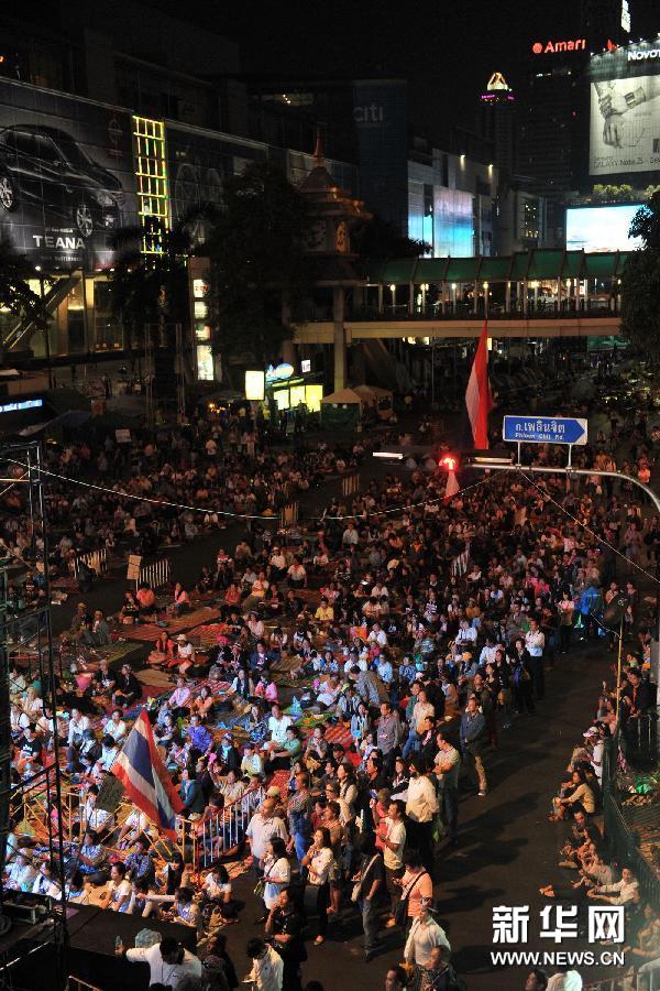 1月21日,在泰国曼谷的商业中心,反政府人士参加集会。泰国看守政府副总理差林21日宣布在曼谷及其周边地区实施紧急状态法,法令从22日开始实施,为期60天。 新华社记者高健钧摄