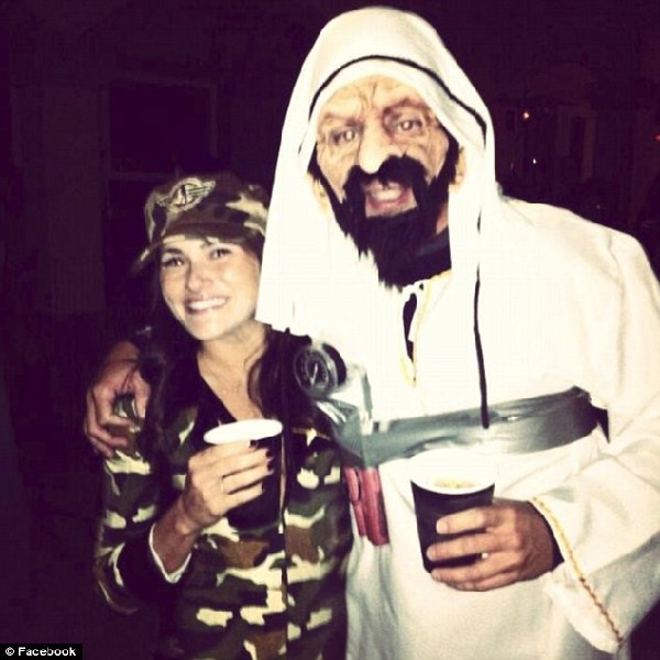 照片显示,身穿迷彩服的阿什莉和一名打扮成基地组织“人弹”模样的男子勾肩搭背。男子穿着一件可以盖住头部顶端的白袍、戴着一个伊斯兰恐怖分子模样的面具,胸口更绑有假炸弹。 >>>点击详细