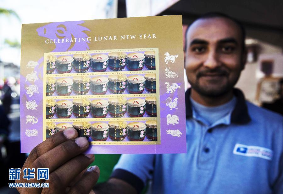 1月25日,在美国洛杉矶,一名美国邮政局的工作人员展示马年邮票。当日,美国邮政局在洛杉矶蒙特利公园举行的新春庙会上发布农历马年邮票。 新华社发(赵汉荣摄)