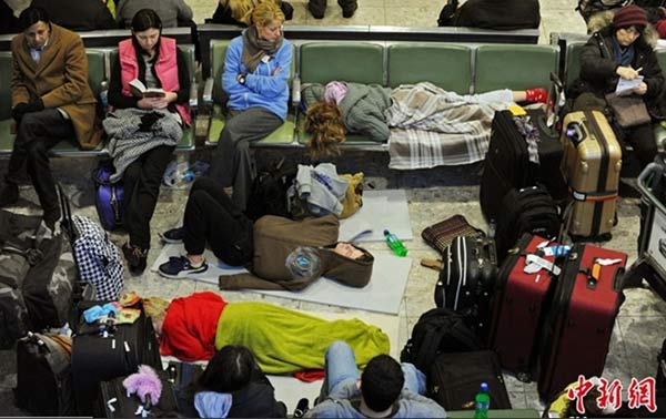 2010年12月21日,英国伦敦,圣诞节客流高峰恰逢大雪导致大量航班停飞,乘客们躺在希斯罗机场候车厅的地上、凳子上,周围堆满了乱放的行李。 >>>详细
