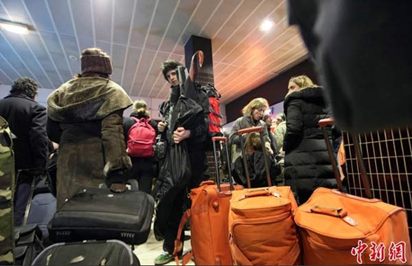 2009年12月18日,法国巴黎,圣诞节来临之前,乘客拖着行李箱等待火车。