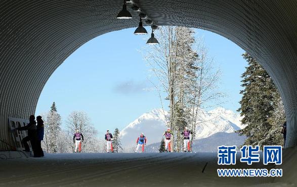 资料图片:2月5日,运动员在训练时穿过赛场的一处隧道。当日,各队运动员来到索契雪上赛区劳拉越野滑雪和冬季两项中心进行适应性训练,以备战8日在这里开始的冬奥会越野滑雪比赛。 新华社记者 王松 摄