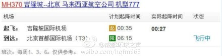 马来西亚航空由吉隆坡飞往北京航班失去联系