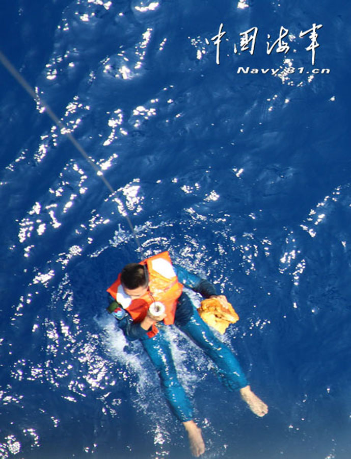 3月11日上午9时20分,刚刚赶到任务海区的中国海军井冈山舰就展开搜救。直升机迅即前出,展开高强度搜索。下午14时30分,第三架次机组准时起飞。经过15分钟的平行搜索后,发现海上有可疑漂浮物,立即标定坐标方位。直升机从200米慢慢降至30米,在多次拍摄漂浮物放大观察,确定为一黄色物体。机长命令救生员悬停打捞查证。14时50分,救生员王梁准备好装具,在绞车协助下缓慢下降到海平面,顺利打捞上一块黄色物体,后经鉴定为日常用的海绵。