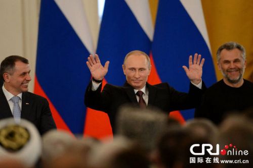 普京对俄罗斯议会上院和下院发表了长达1个小时的演讲。在演讲中,他为克里米亚的回归喝彩叫好。俄罗斯长期把克里米亚视为本国的固有领土,只不过是在1954年由当时的苏联领导人尼基塔•赫鲁晓夫划给乌克兰苏维埃社会主义共和国的。
