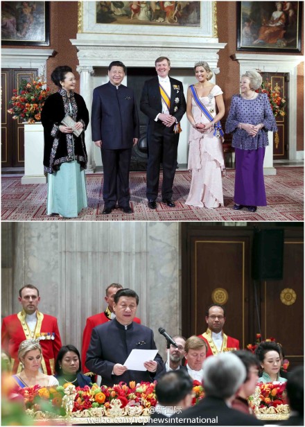 新华网北京3月23日电 据新华社“新国际微博”报道,古老的阿姆斯特丹王宫,郁金香绽放,喜迎中国贵宾。习近平主席和夫人彭丽媛身着中式服装,出席威廉-亚历山大国王举行的盛大国宴。“白领结”盛装宴会,欧洲王室最高规格礼遇。中式服装,中华文化风采。两国元首深入交谈、亲切交流,历时四个小时。
