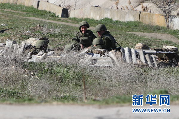 3月23日在克里米亚首府辛菲罗波尔以东100多公里的黑海之滨费奥多西亚拍摄的乌克兰海军陆战队兵营。这是俄军在兵营外战壕内。 新华网记者鲁金博