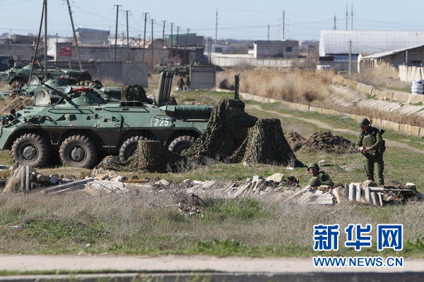 3月23日在克里米亚首府辛菲罗波尔以东100多公里的黑海之滨费奥多西亚拍摄的乌克兰海军陆战队兵营。这是俄军在军营外。 新华网记者鲁金博摄