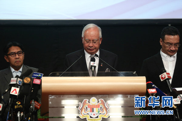 3月24日,在马来西亚吉隆坡,马来西亚总理纳吉布(中)就马航失联航班举行记者会。马来西亚总理纳吉布当日在吉隆坡宣布,根据最新信息,马航失联航班MH370在南印度洋坠毁。 新华社记者 王申 摄